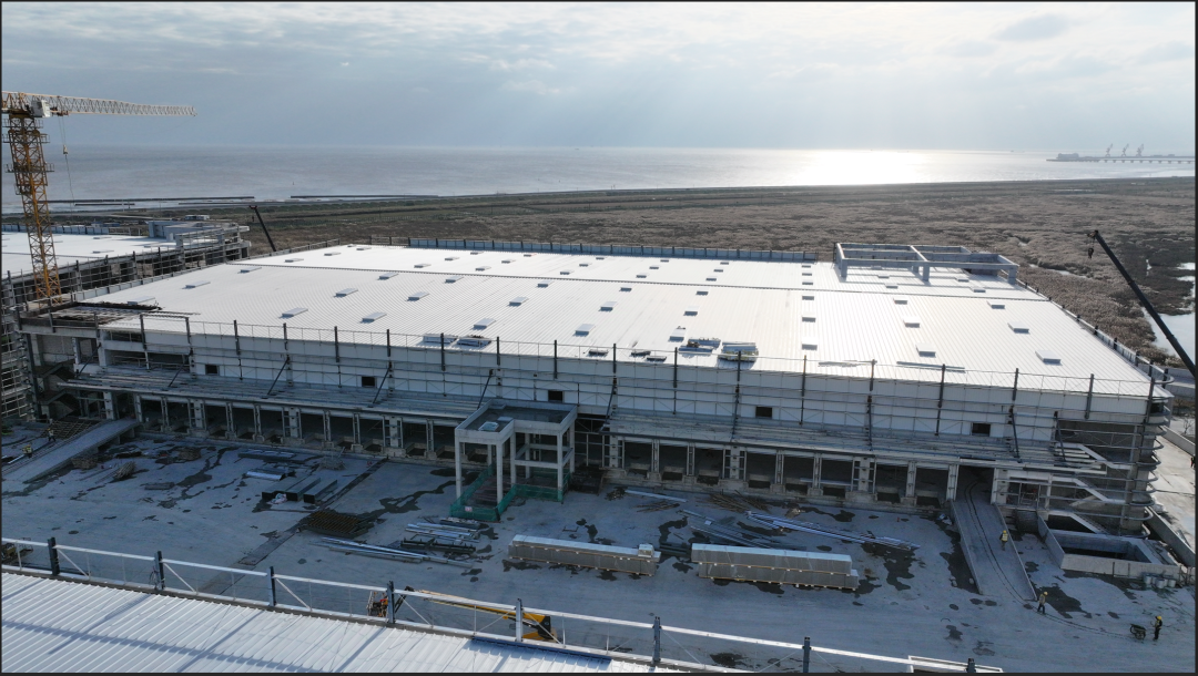 濟(jì)寧一建鋼結(jié)構(gòu)工程有限公司承建的金屬屋面及維護(hù)工程,涉及1#-4#物流倉庫、高架立體庫。倉庫跨度80米,屋面標(biāo)高34.1米,為雙向找坡結(jié)構(gòu)。該項目建設(shè)規(guī)模大、工期緊、技術(shù)精度要求高、工況復(fù)雜,自項目開始施工。公司對現(xiàn)場管理嚴(yán)格要求,積極配合業(yè)主及總包的整體調(diào)配,施工嚴(yán)格執(zhí)行施工方案,遵循規(guī)范標(biāo)準(zhǔn),合理安排人、機(jī)、料等,戮力同心將馬士基臨港旗艦倉項目打造成精 品工程、優(yōu) 質(zhì)工程。